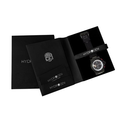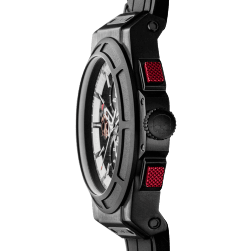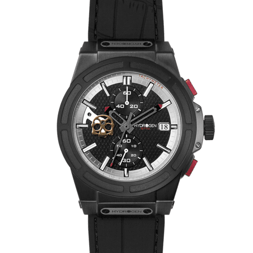 Den svarta kolfibermönstrade urtavlan förstärker den tekniska och moderna känslan.